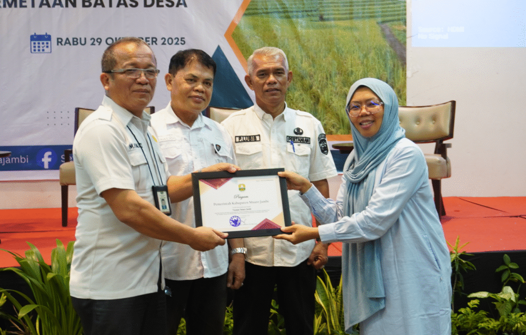 Yayasan Setara Jambi menerima penghargaan dari Pemda Muaro Jambi atas penyelenggaraan program peningkatan kapasitas dan pemetaan partisipatif desa dan penataan ruang desa berbasis pada tujuan pembangunan berkelanjutan di Kabupaten Muaro Jambi. (Photo: Yayasan Setara Jambi)